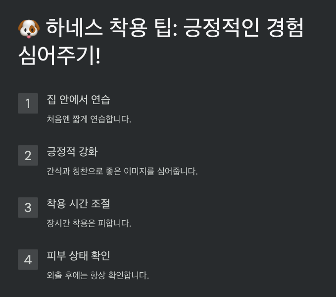 처음엔 집 안에서 짧게 연습하고, 간식과 칭찬으로 긍정적 이미지를 심어주세요.