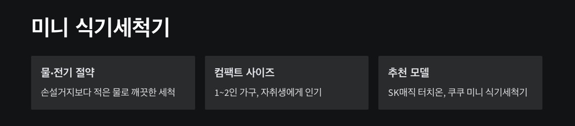 - 추천 모델: SK매직 터치온, 쿠쿠 미니 식기세척기