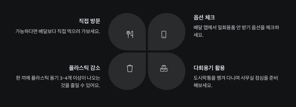 배달 앱에서 일회용품 안 받기 옵션을 체크하는 것만으로도 실천이 됩니다.