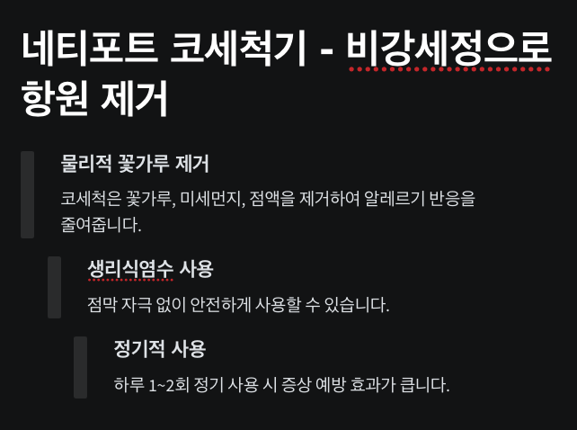 코세척은 물리적으로 꽃가루, 미세먼지, 점액을 제거하여 알레르기 반응을 줄여주는 비약물적 치료법입니다.