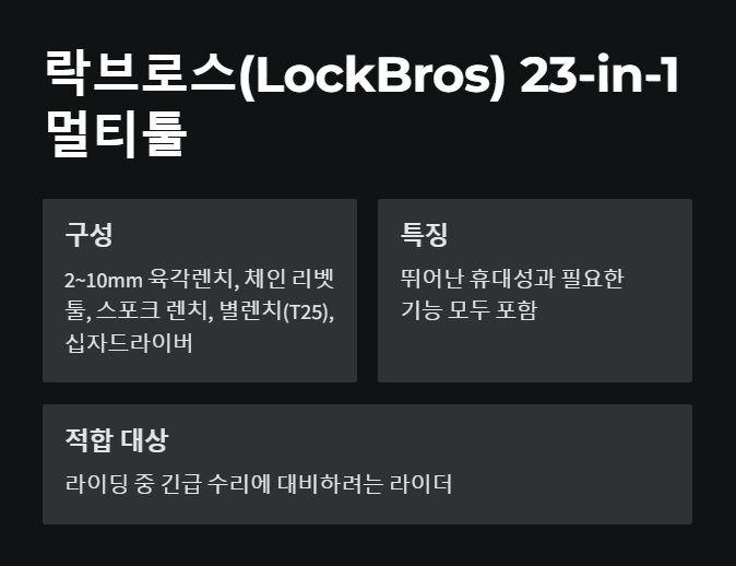 - 적합 대상: 라이딩 중 긴급 수리에 대비하려는 라이더